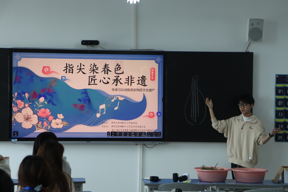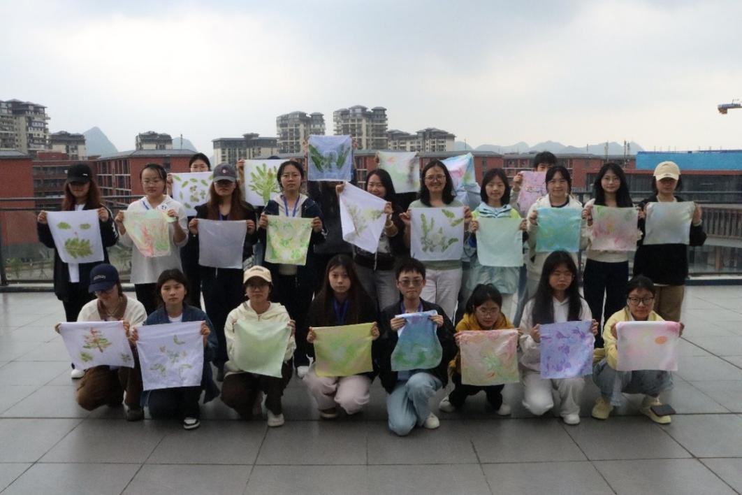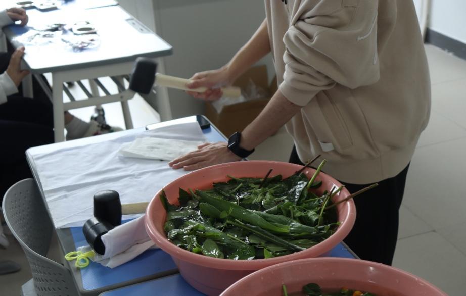 在老师的悉心指导下,同学们认真挑选形态各异的叶片与花瓣,结合个人创意巧妙排布构图,将花叶固定于布料或纸张之上,通过均匀、适度的敲击,把植物天然脉络清晰拓印于纸面,随后依次进行定型、整理等工序。大家凝神专注、静心创作,在一锤一印间感受传统技艺的细腻与温度,将寻常草木化作一件件独具自然意趣的非遗作品。