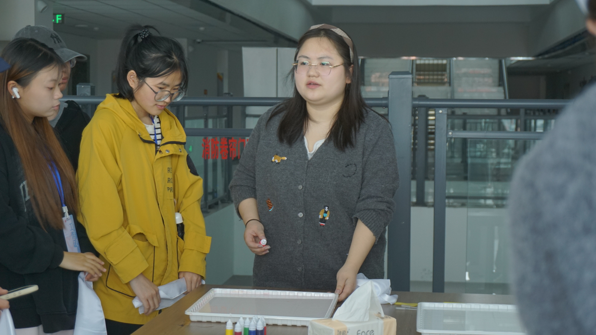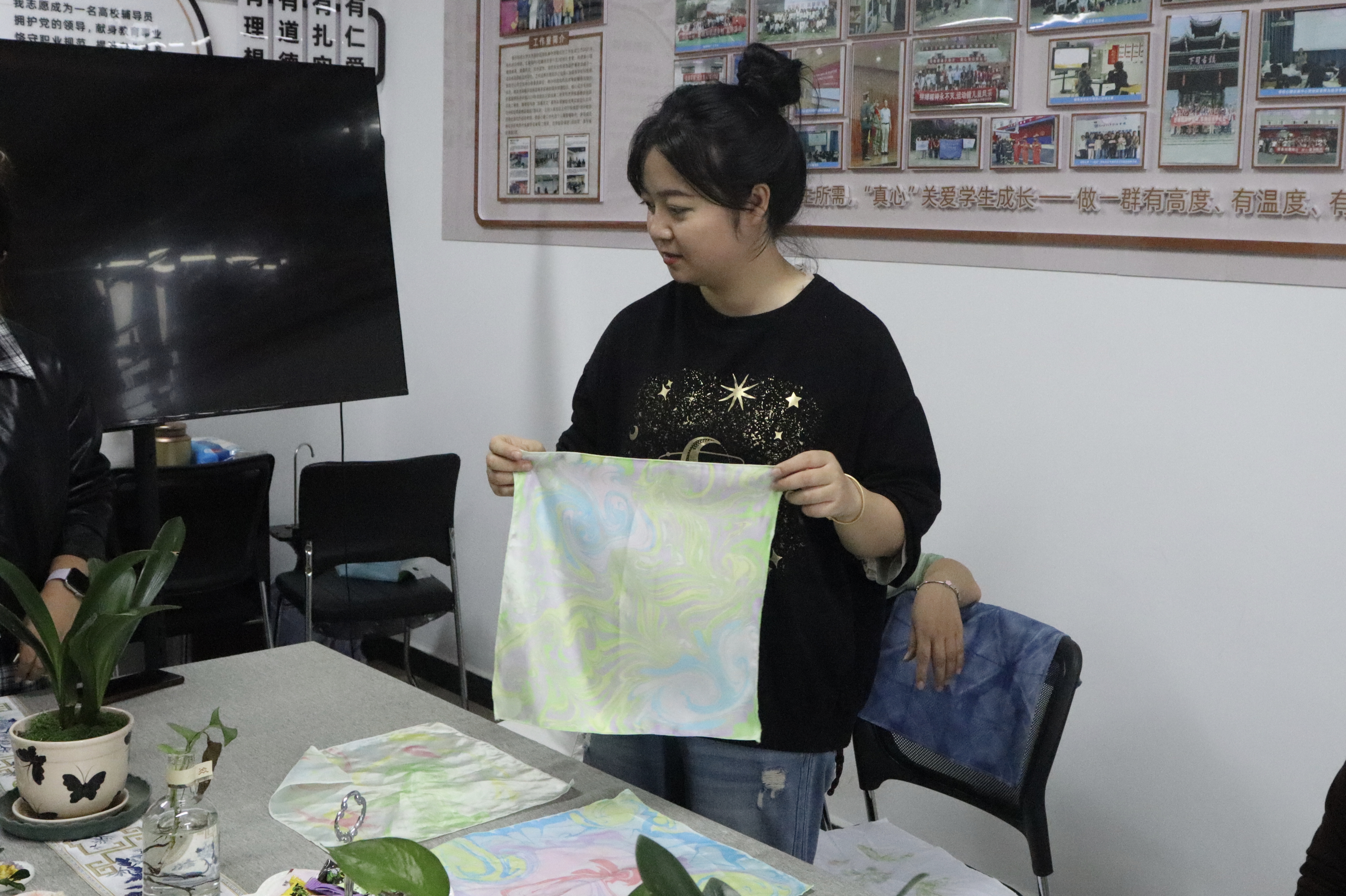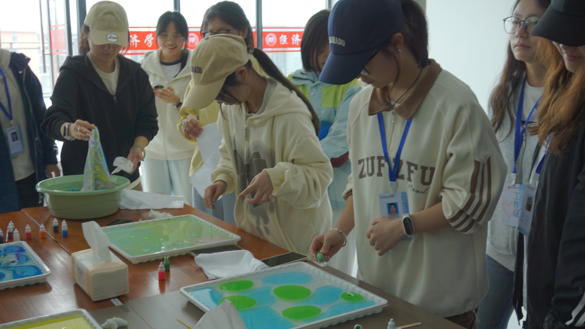 本次活动特邀非遗手工艺老师杨官梨现场教学指导。杨老师结合多年非遗创作经验,围绕水面调控、颜料滴洒、色彩搭配和拓印技巧进行基础教学,细致拆解操作要点,手把手指导学生掌握核心技法,帮助大家快速熟悉水拓创作流程。