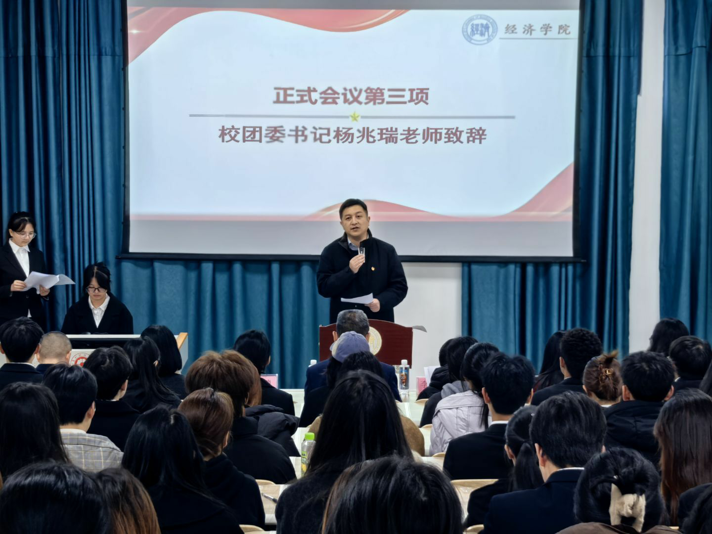 学生科副科长杨志远以及50余名大会代表参与此次会议。会议在庄严的国歌声中正式拉开帷幕。
