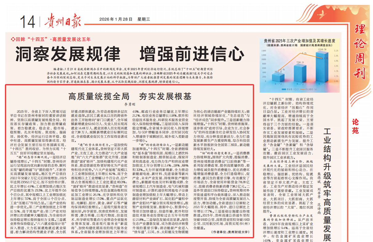 《贵州日报》刊发pc28开奖 李勇刚教授理论文章《高质量统揽全局 夯实发展根基》